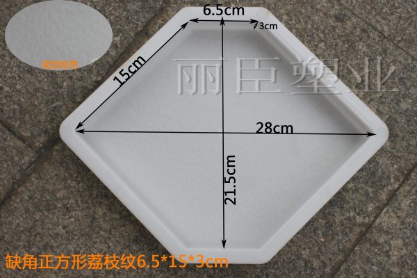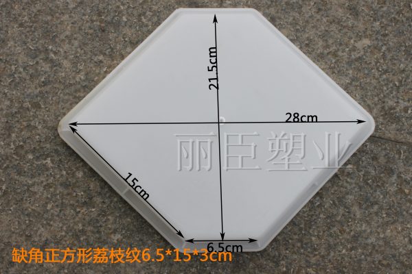 此產(chǎn)品專供西安客戶的一款彩磚模具,主要結(jié)構(gòu)以正方形缺角形狀設(shè)計,其中底部為荔枝紋圖案,即所預(yù)制水泥彩磚成品表面為防滑荔枝紋圖案。此西安彩磚模具對角對稱長度為28CM,缺角對稱長度為21.5CM,詳細(xì)見下圖。