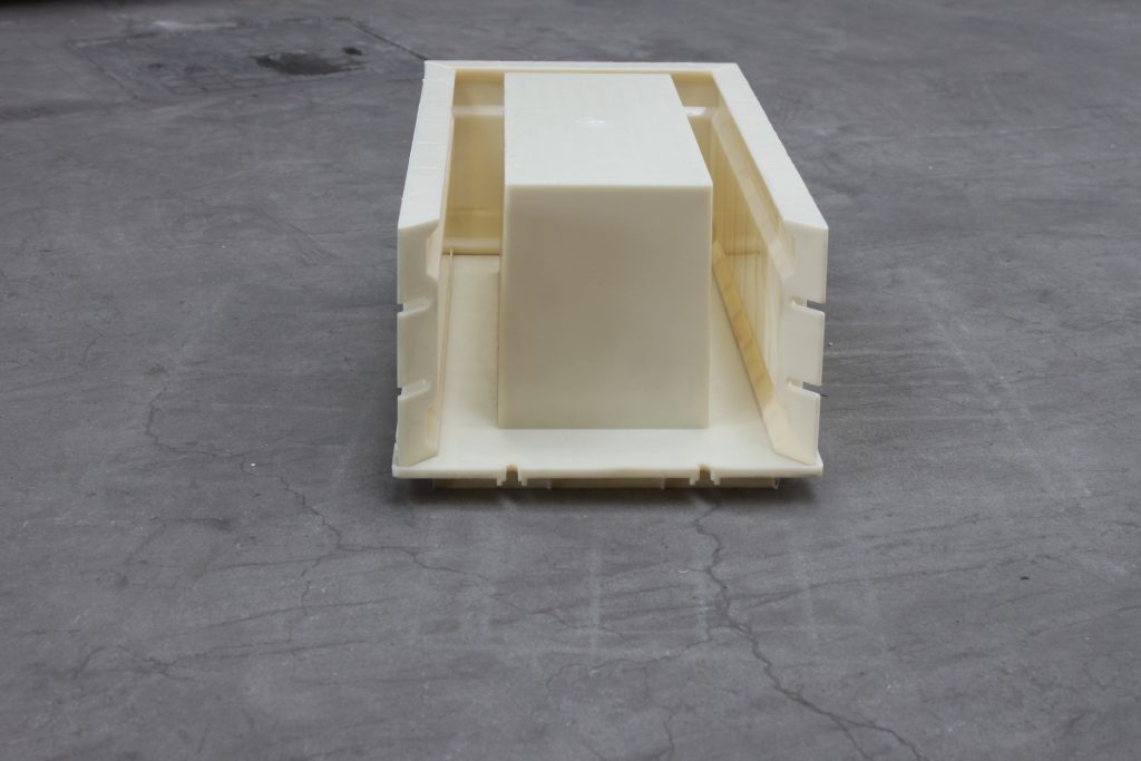ABS材質的空心磚塑料模具,整體呈長方形樣式,總共分為三個部分,空心磚塑料模具底座、側面短板及側面長板,在長板與短板鏈接處均采用橢圓凹槽,用于鐵質螺絲螺帽拆卸裝配。鑒于塑料模具自身尺寸較大,為了使得空心磚塑料模具施工更為耐用牢固,在每一個配件背部分別采用十字加強筋設計,以確保正常施工。