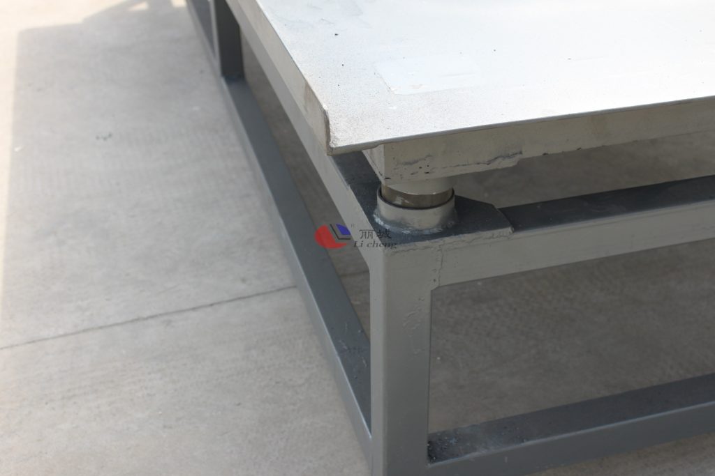 對于尺寸規(guī)格較大的水泥制品模具,在澆筑過程中不方便將模具內(nèi)的空氣,以及混凝土在模具中的均勻攤平,通過使用振動臺來將內(nèi)部空氣排放和混凝土的振實。振動臺四個臺腳處都設(shè)計上了墊腳,在震動過程中能保持平衡。