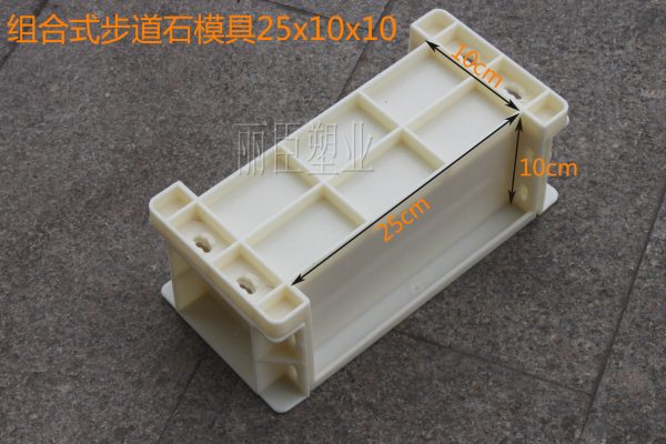 其塑料模具本身的規(guī)格的25x10x10cm,而堵在模具兩邊的堵頭規(guī)格為10x10cm。這樣的設(shè)計(jì)主要是對(duì)于步道石模具在澆筑成型后脫模過(guò)程中較為便利,只需將固定組步道石模具的鎖扣進(jìn)行拆除后,便能較為便利的進(jìn)行模具的脫模,所以麗臣在對(duì)著款模具上取名為組合式步道石模具。