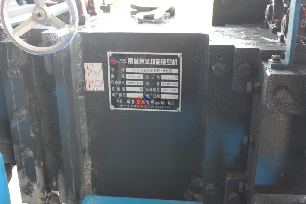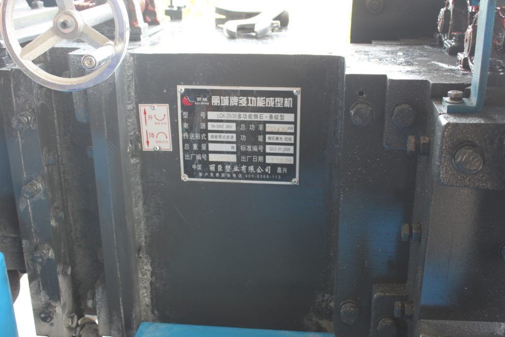 這款LCK-25/30多功能側(cè)石二工位條紋成型機,其主要功能是對澆筑成型的水泥模具進行二次加工成型,其機器總功率為22.05KW,其傳送形式為調(diào)頻帶式步進,電源使用的標準為3N-50HZ 380V。