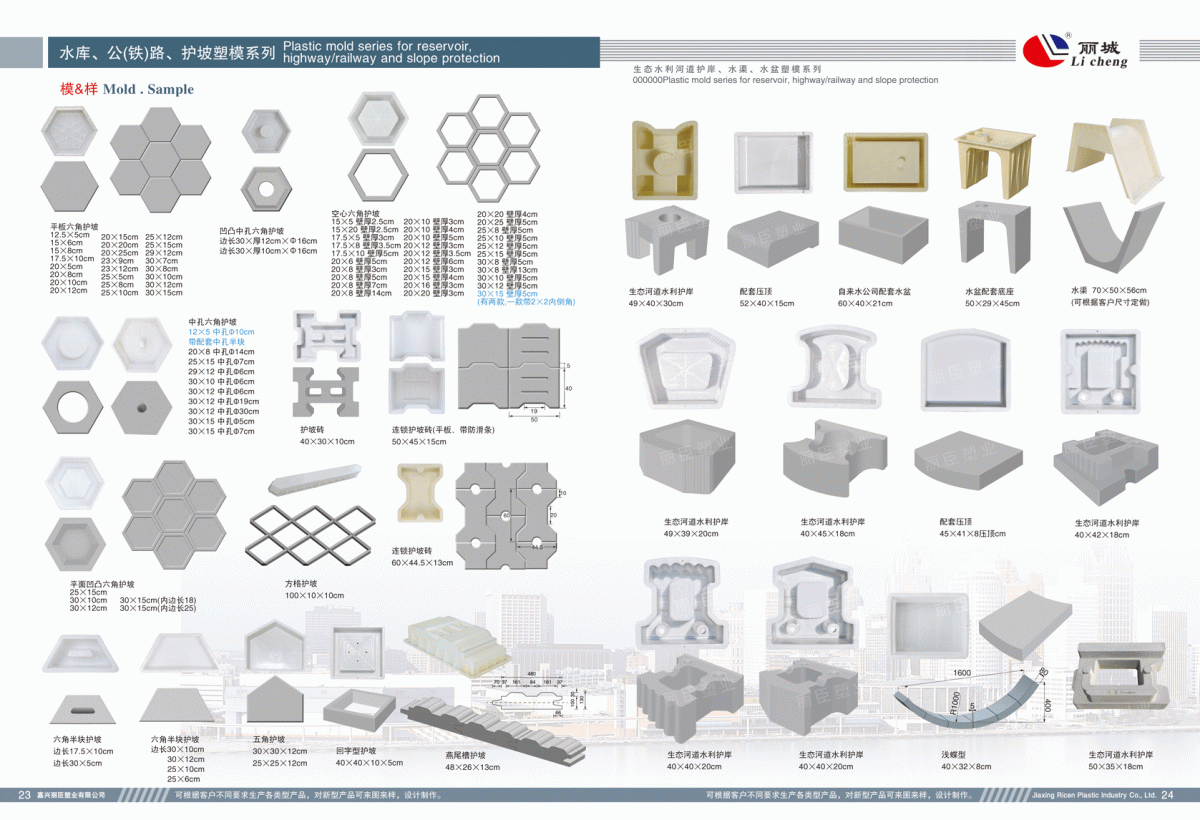 23:水利護(hù)坡模具、公路鐵路護(hù)坡塑料模具系列 ? ? ? ? ? ? ? ? ? ? ? ? ? ? ? ? ? ? ? ? ?24:生態(tài)水利河道護(hù)岸、水渠、水盆塑模系列