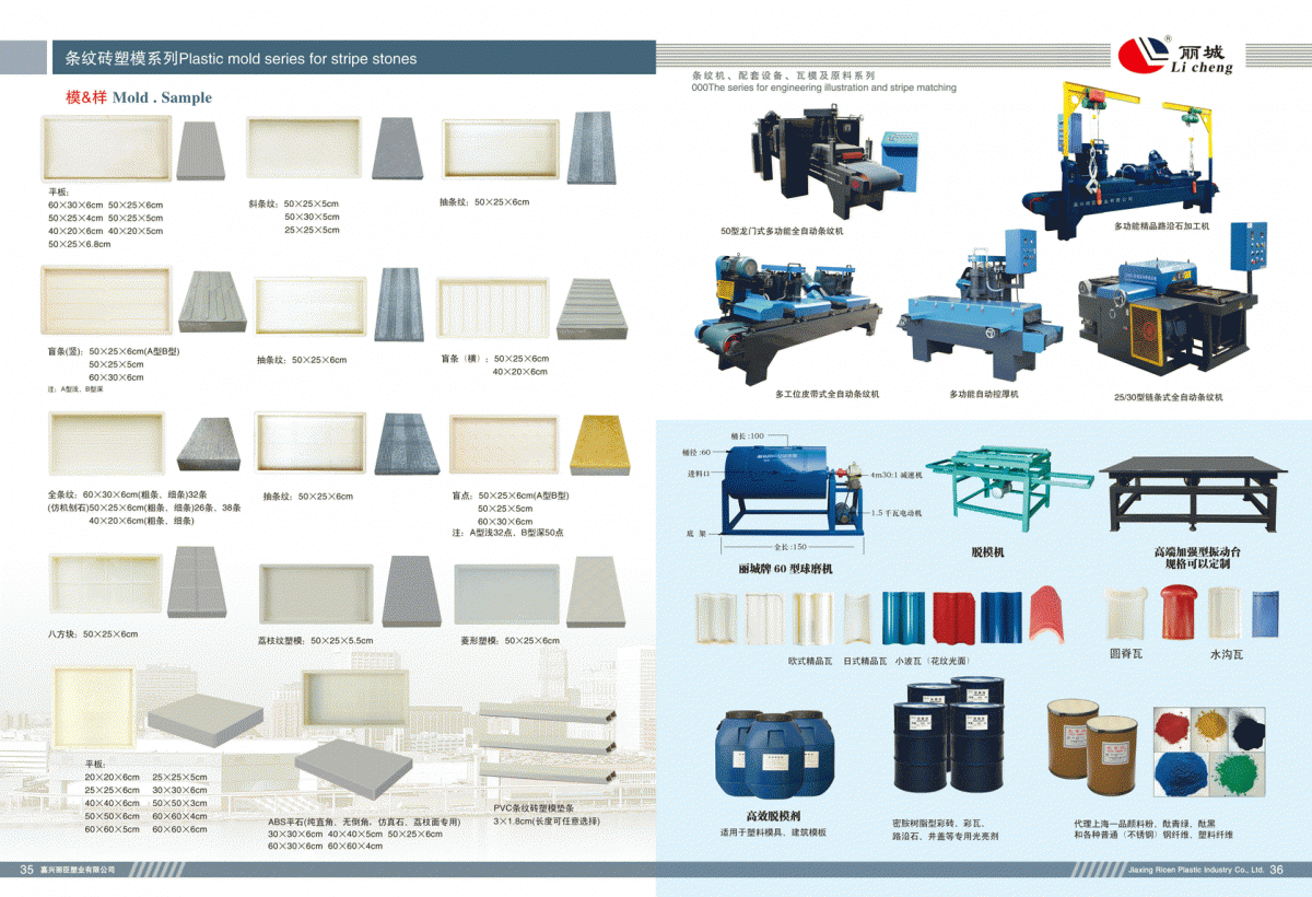 35:條紋磚模具系列 ? ? ? ? ? ? ? ? ? ? ? ? ? ? ? ? ? ? ? ? ? ? ? ? ? ? ? ? ? ??36:條紋機(jī)、路沿石精加工機(jī)械設(shè)備及配套設(shè)備、瓦模、原料系列
