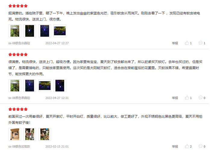 二、裝了戶外滅蚊燈之后體感如何前面我們說了,很多人認為戶外滅蚊燈是智商稅,疑慮就在于這里。事實上,根據我們多年的經驗和用戶反饋,只要是在滅蚊燈“殺傷力”范圍內,蚊子困擾是可以明顯緩解的。至于這個“殺傷半徑”,你可以在產品的介紹上查看,也可以說明自身情況,讓商家給推薦,這樣才會實現更好的滅蚊效果。你擔心蚊子“取之不盡用之不竭”,其實滅蚊燈也不那么差勁,它可以持續、自動消滅蚊子,只要路過的,就有機會被永遠地留下來。